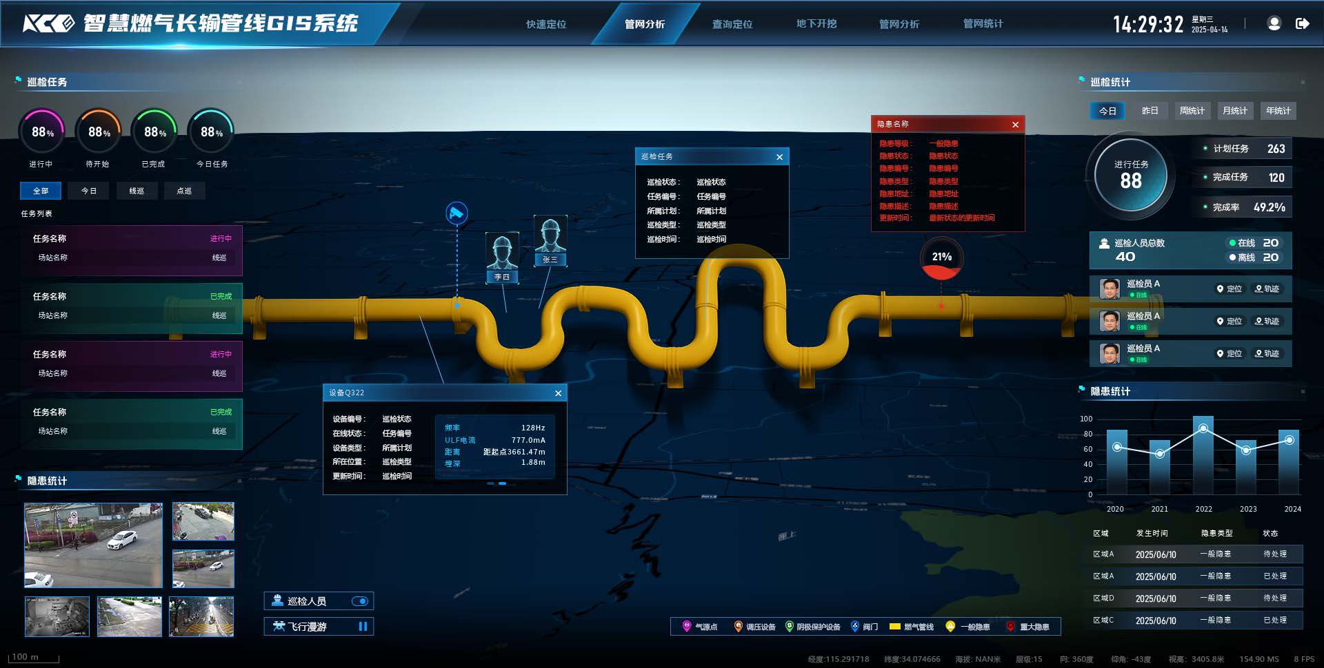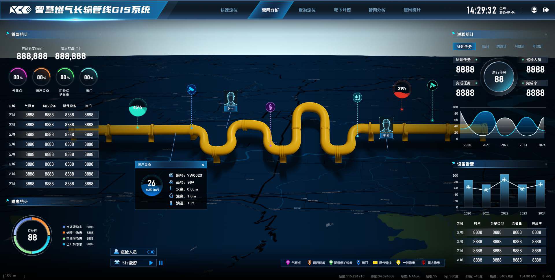 KCGIS智慧燃气长输管线GIS系统是一个高度专业化的数字管控平台。它能够实现对燃气长输管线本体、沿线阀室、站场及高后果区的全方位、一体化实时监测,从而精准识别并 预警潜在风险,极大提升应急响应与处置效率,全面保障国家能源动脉的安全。